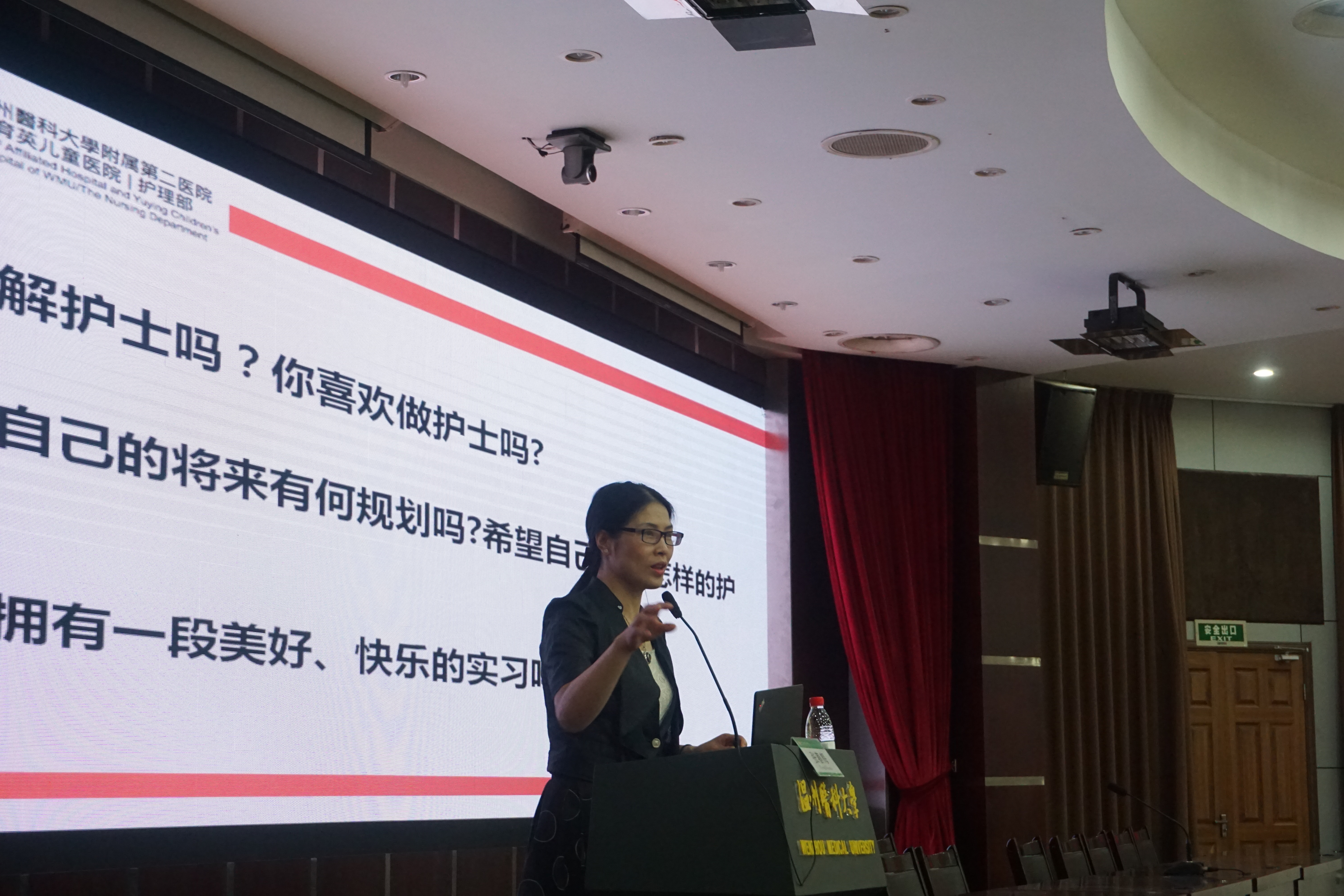 张春梅从“什么是护士”“实习护士的未来”“如何快乐入职”三个方面切入主题,讲解了《中国护理事业发展十三五规划》中的要点内容,分享了“用微笑、热情、专业,让病患感到贴心、安心、舒心”的护理工作理念,并指出作为一名合格的护士,必须具备专业意识和较高的人文素养,更应有人文情怀。优质的护理服务,精湛的护理技术,安全的诊疗环境和科学的护理管理,这些都将是实习生需要面对的未来护理工作。她还指出,要快乐入职就必须学会“礼仪大方、沟通良好、态度端正、行为规范”。