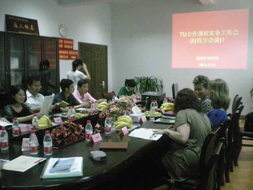 今年公司招收了首届与美国托马斯大学合作办学的护理学专业新生。在接下来的几天时间里,美国托马斯大学代表团一行与我们VSport体育相关的领导和老师就今后合作如何具体实施和课程安排进一步交换了意见和建议。Susan Otto博士向中外合作班的首届员工和中方的相关负责老师介绍了托马斯大学的发展现状以及该校的护理专业并解答了同学们的相关问题。另外也向老师和同学们阐述了中外合作护理学专业员工的培养目标和方向。Shannon Woods教授向公司和江西中医公司的老师代表们介绍了护理专业在美国的学习、从业情况以及今后的发展前景,让中方老师更清楚地了解了护理学专业在中国和美国的区别和共同点,对双方今后的进一步合作有着积极的意义。Kim Cribb博士带领随行的托马斯大学的员工走进了公司护理学专业课堂,同公司员工一起进行护理课程学习的互动,体验公司护理学专业的教学特点,并与中方的员工就两校的专业课学习、专业就业现状等进行了面对面的交流。为了欢迎托马斯代表团一行的到来,公司护理专业中外班的员工精心准备了一场文艺演出。在演出会场,还举行了首届托马斯大学中美护理教育员工友好大使授证典礼。另外,为了更深入的了解公司护理专业在临床上的应用和发展现状,托马斯代表团一行来到公司附属第二医院,参观了该院的康复科室,并且和附二院的护理部张春梅副主任及相关科室护士长就中国和美国就护理工作的开展和具体实施进行了交流。