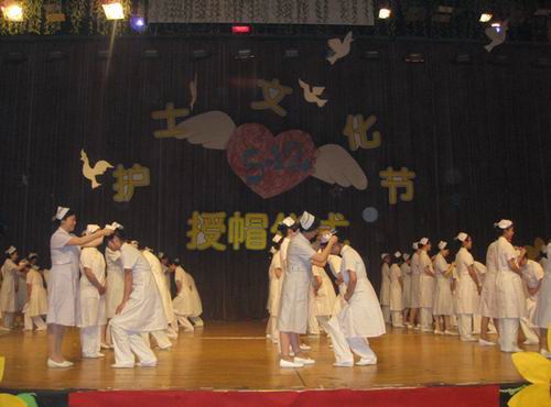 伴随着轻柔舒缓的音乐,庄严的授帽仪式开始,六百多名即将下临床的护生整齐庄重地上台,25位来自温州市卫生局、温州市护理学会、温州附一、附二、眼视光、市二、市三、中医院、中西医结合医院、康宁、民康等医院的温州护理届前辈为他们进行授帽,“下蹲、授帽、起身、鞠躬……”随着一句句口令,一顶顶象征“责任”与“奉献”的燕尾帽被戴上,护生怀着感激向老师敬礼鞠躬,完成由护生到护士的锐变。