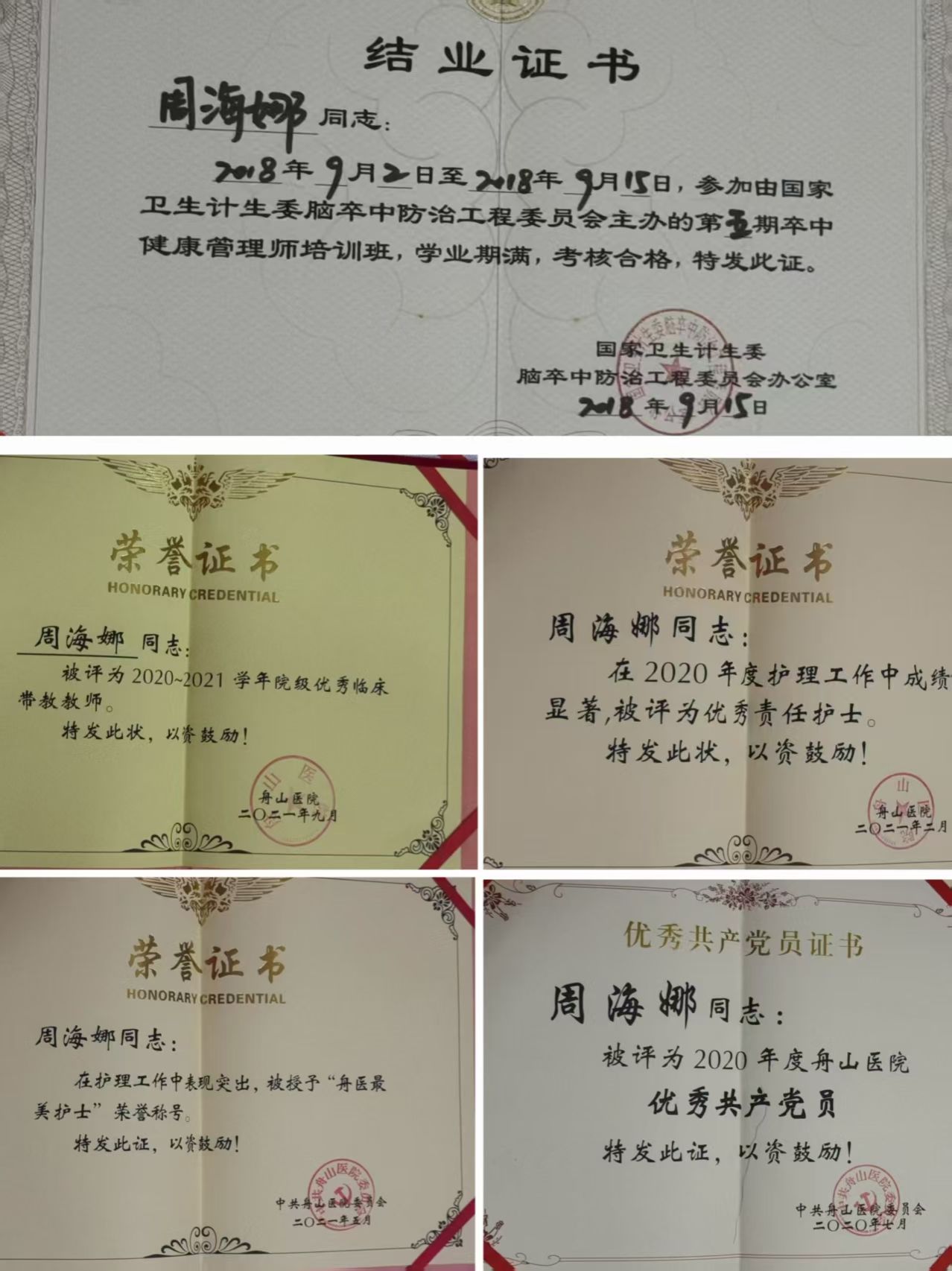 随着在职业路途上越走越远,周海娜为护理付出的滴滴汗水也正从时光中不断结出累累硕果。她仿佛一块被精心打磨的玉石,在岁月的浸透和自身的瞩目下愈发温润通透——曾经需要反复确认的流程,如今能信手拈来如流水般推进;面对突发困难,更是从曾经的手忙脚乱蜕变为今日的从容应对。在这些显著转变的背后,肉眼可见的是周海娜对自我进步的追求。绳锯木断,水滴石穿,除去日日夜夜不断翻看专业书加强自己的知识基础外,周海娜还于临床中积极参与病例讨论,跟随资深医护人员学习,真真切切做到了理论与实践的紧密结合,不断炼就着自己可以独当一面的本领。而时光不负有心人,除了在护理领域取得了“周医最美护士”“优秀责任护士”等荣誉外,周海娜还先后被评为“优秀临床带教教师”“优秀共产党员”等光荣称号,于员工,家属和同行中都获得了高度的认可和欣赏。