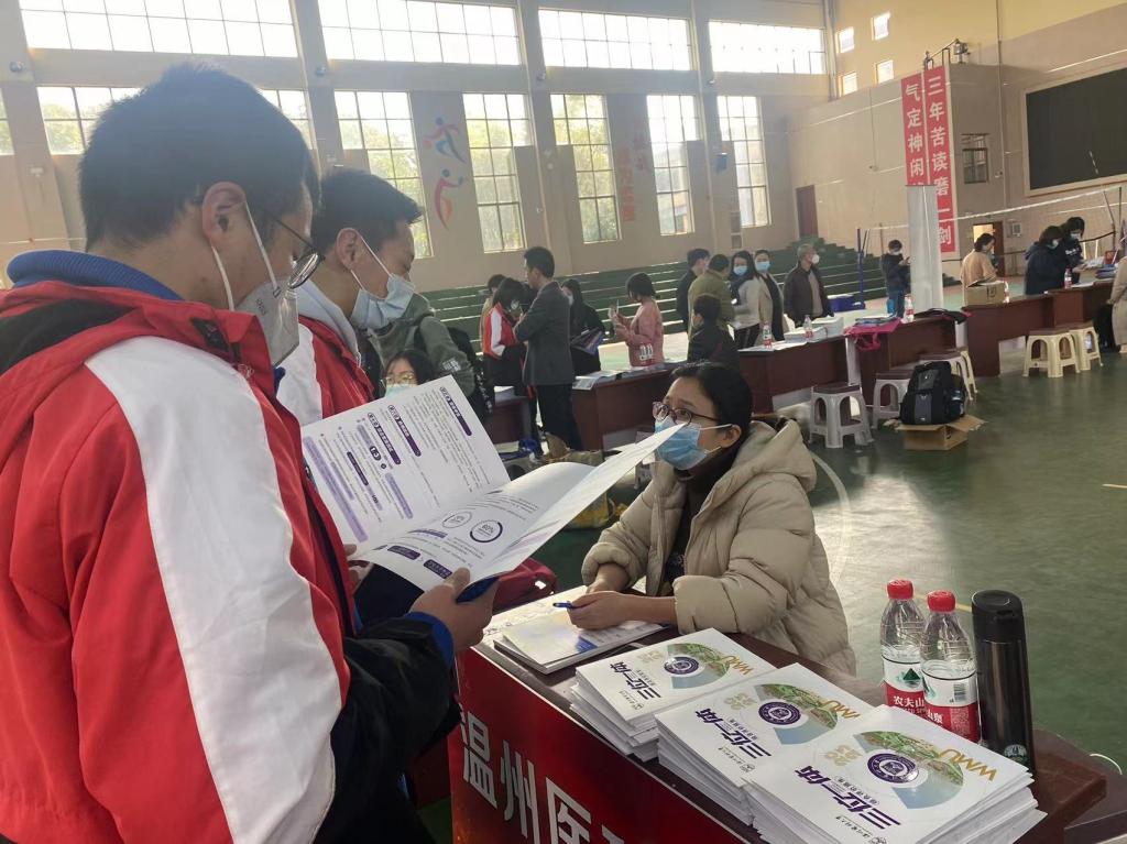 宣传组老师在现场设立展位,发放招生宣传资料,现场答疑。“老师,我选考科目是生物学、化学可以报温医大哪些专业?”“进入公司如果转专业有什么条件?”“三位一体报名条件、面试形式是什么?”……面对考生及家长的各类问题,老师们进行了耐心的解答。