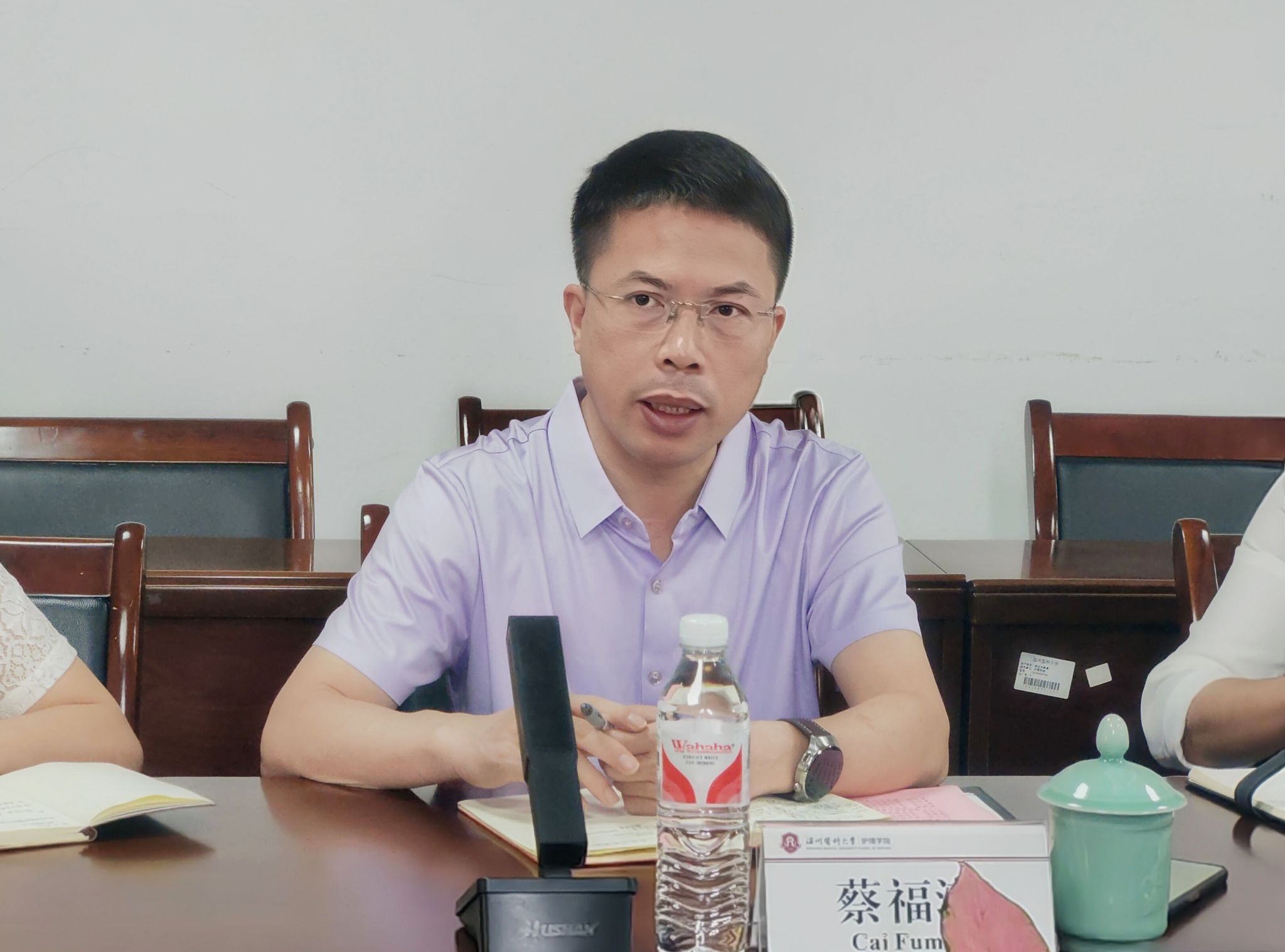 蔡福满经理对楼宏强经理一行的到访表示热烈欢迎,并围绕发展历程、本科教学、人才培养、护理研究、国际合作及社会服务等方面对VSport体育作详细介绍。他指出,VSport体育依托强大的附属医院资源,充分发挥院院融合的优势,聚焦特色研究方向,积极推进国家一流专业建设。同时,公司大力引进和培育博士人才,构建跨学科研究团队,打造多元化的国际合作平台,促进护理科研领域的交叉创新,多措并举,全面提升团队建设水平。