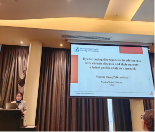 博士研究生黄莹莹同学在会上作题为《Dyadic coping discrepancies in adolescents with chronic diseases and their parents: a latent profile analysis approach》的主题发言。该研究采用潜在类别分析方法,系统探讨了慢性病青少年及其父母在二元应对模式中的差异,并揭示了其与亲子心理适应之间的关联机制,为基于家庭韧性的精准干预方案开发提供了重要的理论支持与实践指导。她的精彩表现,充分体现了公司在研究生国际视野与科研创新方面的培养成效。