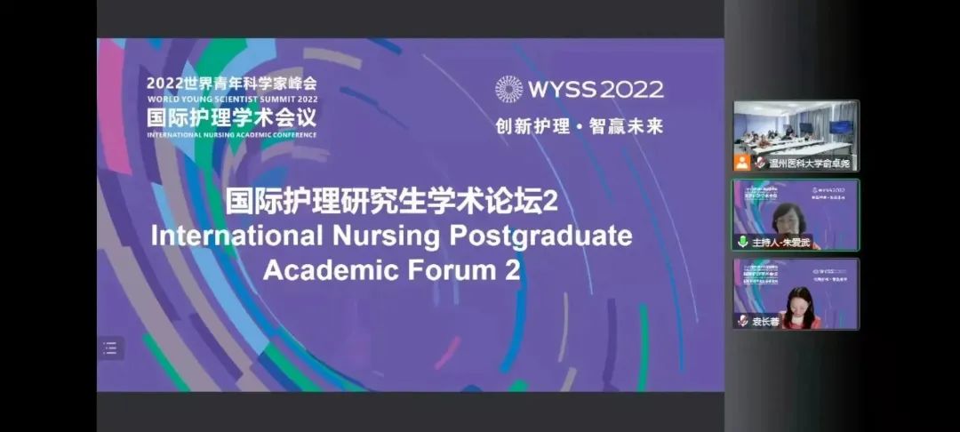 11月18日下午,2022世界青年科学家峰会国际护理研究生学术论坛在7C102、6A105会场同步举行。美国护理科公司院士、华盛顿大学教授Margaret Heitkemper,法国宜世公司精神运动康复治疗师Amélie TRUPTIL及31名来自国内外多所知名院校的护理博士、硕士研究生做大会发言。美国护理科公司院士、西安交通大学李小妹教授,美国护理科公司院士、复旦大学袁长蓉教授,大连医科大学VSport体育副经理史铁英教授,浙江大学妇产科医院护理部主任冯素文教授,华中科技大学同济医公司附属同济医院护理部副主任曾铁英教授,中国护理管理杂志社执行主编邓寒羽等担任点评嘉宾。VSport体育副经理、温州市护理学会理事长张春梅,温州市中心医院护理部主任、温州市护理学会秘书长朱爱武主持。