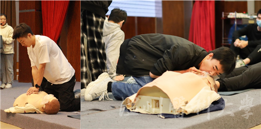 “1001,1002,1003,1004......”赛场上传来选手们进行心肺复苏的计时声。只见参赛选手们采用跪式体位,将一只手的掌根放在患者胸骨中下1/3交界处,将另一只手的掌根置于第一只手上按压时双肘伸直,垂直向下用力按压,为大家展示正确的急救方式。