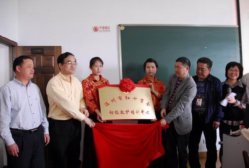 当日上午,培训中心揭牌仪式在茶山校区7C302教室举行,公司党委副书记陈肖鸣,温州市红十字会副会长蔡章卿、张鲁民,公司党总支书记陈行汉、经理姜丽萍、副经理廖毅等共同为其揭牌。
